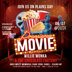 Get all the details about our Plains Day “Movie Under the Stars” featuring “Charlie and the Chocolate Factory,” including the start time, by visiting our website at CFRRADIO. COM Don’t miss this special Plains Day treat, brought to you by Clark Fork River Radio and Deb Warren from Century 21! We can’t wait to see you at The Grey Welty Memorial Park on Saturday, June 7th!